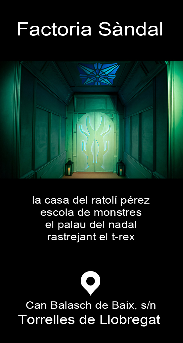 Les experiències de Factoria Sàndal (La Casa del Ratolí Pérez, Escola de Monstres, El Palau del Nadal i Rastrejant el T-Rex) es fan en una nau que trobareu a la zona Nord dins el recinte de Catalunya en Miniatura (Torrelles de Llobregat).